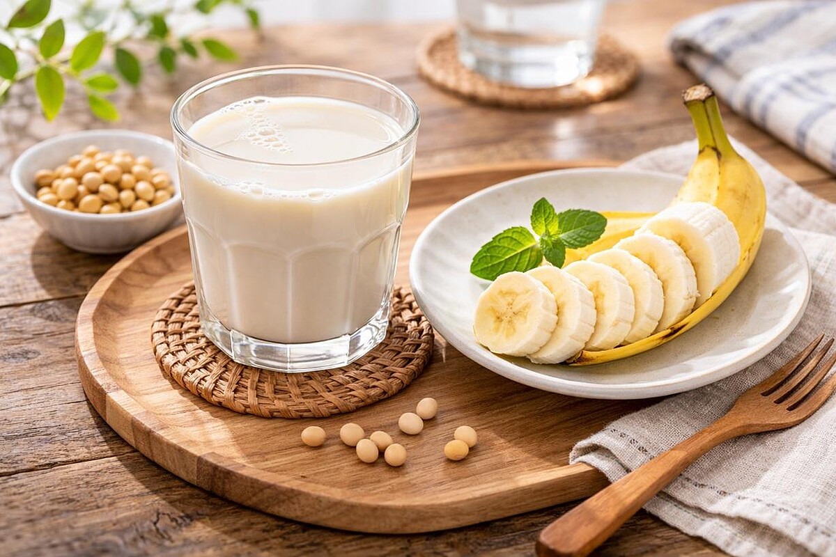 無糖豆漿+半根香蕉 或:溫熱椰子水+水煮蛋