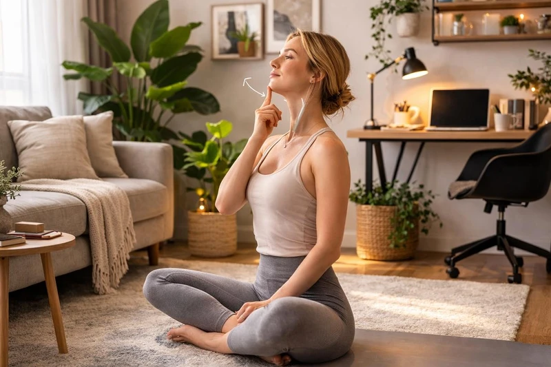 ●食指輕輕抵住下巴,吸氣時下巴微微向上抬。
