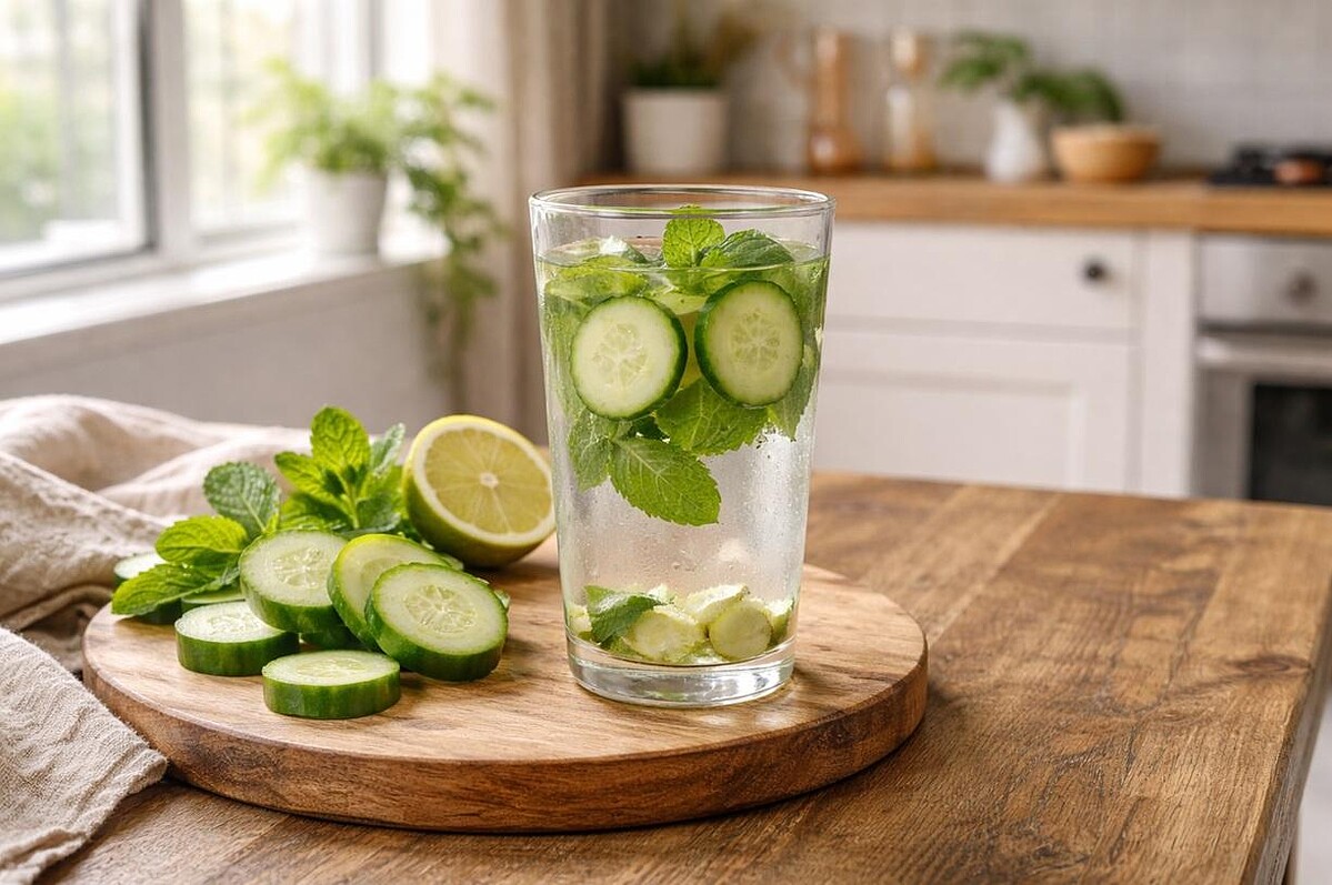 食材:1/2根小黃瓜、一把新鮮薄荷葉、少許檸檬。