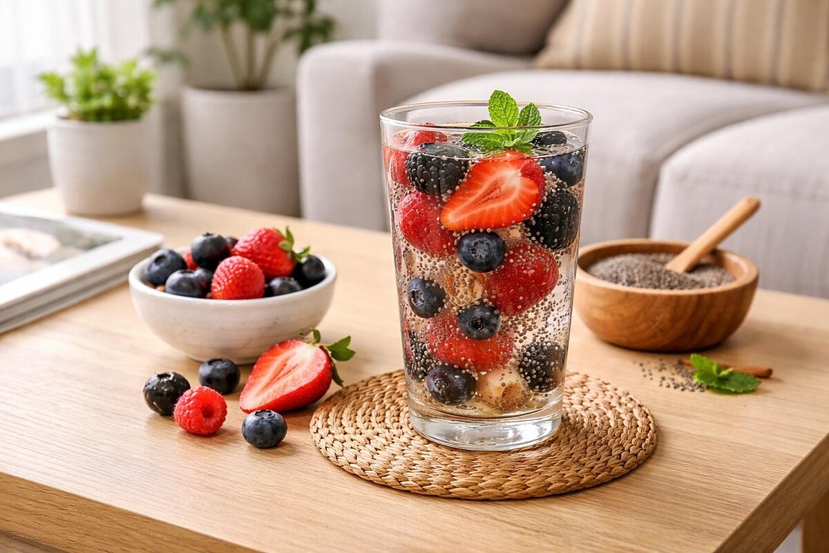 食材:混合莓果(草莓、藍莓)、奇亞籽 1 匙、氣泡水或涼開水。