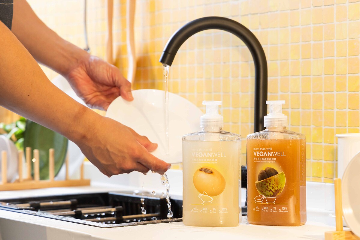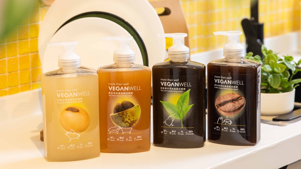 VEGANWELL就是在這樣的契機下誕生。陳俊偉說明,VEGANWELL的洗碗精仍以天然胺基酸界面活性劑為基礎,包括癸基葡糖苷、月桂醯肌氨酸鈉與甜菜鹼等成份,維持基本的清潔力與起泡性,但配方中加入茶籽、咖啡、豆渣等廢渣纖維,讓清潔機制不完全依賴界面活性劑。