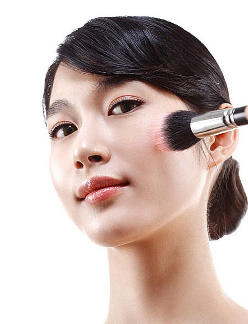 Vicky:常見的腮紅刷是尖端呈半圓形的扇形刷毛,質感比較鬆,很容易抓粉吃色,為雙頰打造紅潤大面積的好氣色;另一種是呈斜角形,比較扁,適合作為修容,或在眼尾外C處局部重點提亮。建議在準備腮紅刷時,最好將粉紅色和橘色調分開,避免妝感混濁變髒;若是有珠光提亮需求,也需單獨使用,因為刷子本身的抓色力重,一旦混合其他彩妝刷腮紅,會顯不出效果。