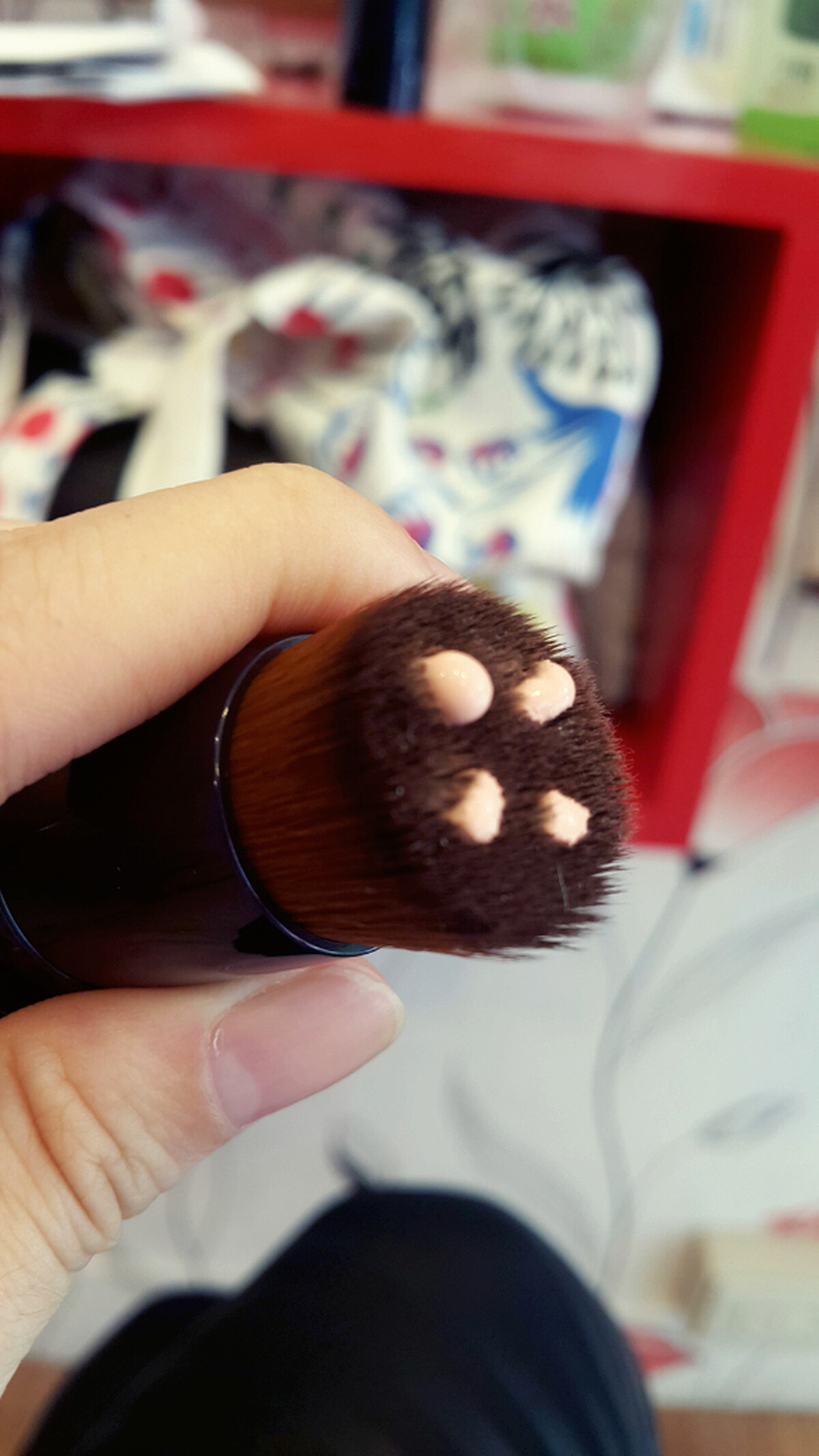 各位可以參考最右圖是刷在手上,中間這張是剛刷上兩下,還有一點粉霧狀感,但完全看不出粉。最左邊的圖則是用刷子把粉底液給推勻了,顏色果然整體提亮。
