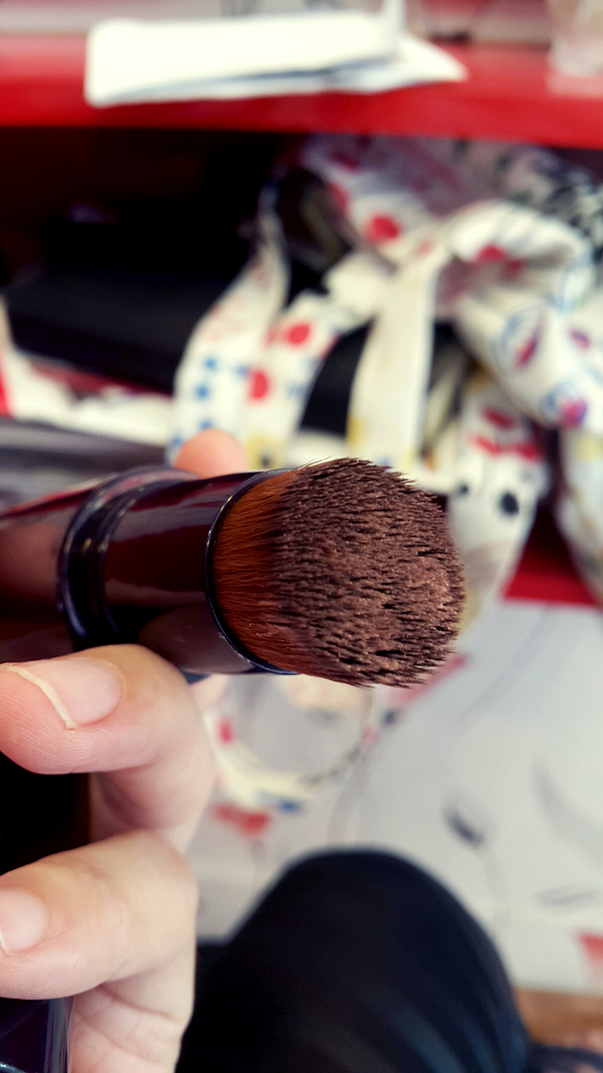 2) 加班熬夜,臉色蠟黃像剛生完孩子、家人朋友就吵著要來探訪的媽媽的時候,我反而是喜歡把這支粉底刷拿來做校正效果用,前端先上妝感強一點的粉底液,然後容易帶點蠟黃的T字則是適度點上,需要被提亮的兩頰顴骨、大膽刷上,運用它美美的薔薇粉,來扭轉那種根深蒂固的黃,不僅遮瑕效果好,也不擔心疲累肌會不會太乾脫妝,粉嫩的明亮感,會讓人差點忘了自己前一天加班有多慘。