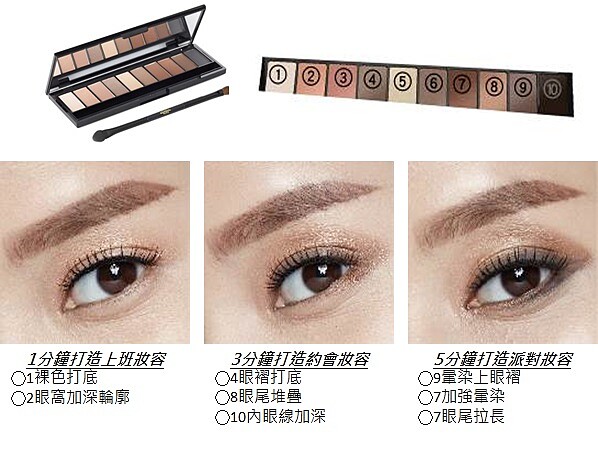 「經典奢華10色眼影盤」,透過巴黎萊雅所設計完美互相呼應的眼影色彩,讓妳零失手也能輕鬆眼藝1000種裸色眼妝!再搭配能創造3D立體深邃感的「3合1立體眉彩筆」,讓妳不費力氣擁有所有人都稱羨的百分百巴黎時尚妝容!至於怎麼打造法國女人的性感又優雅的妝容,下面示範妝容快來試試: