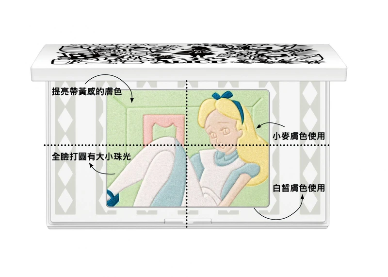 打開如剪紙畫般的黑白色調外空盒,立見墜入小房間中的愛麗絲設計圖騰,截取自童話故事中一段場景的繽紛多采修色盤。具有抑制紅感的綠色調、增添閃耀光芒的黃、酷藍、能提亮膚色的白、女人味的粉紅、使膚色均勻的裸棕色等共組合了6色。