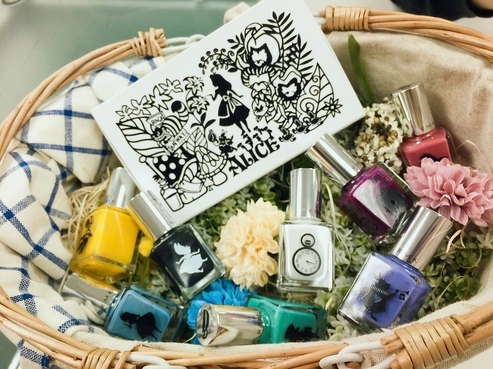 這次同時推出的商品還有「愛麗絲夢遊仙境」中8個人物圖騰包裝的絕色指甲油限定色。圓型瓶蓋上印有愛麗絲夢遊仙境主題的集錦,冒險隧道、玫瑰樹等出現在愛麗絲夢遊仙境中的各種色調,每一個顏色都能展現出個性甜美感。其中白色和黑色是粉霧質感,而紫色及莓果色則是帶半透明的果凍感,其餘色彩則是以珠光表現出好搭色的的嬉玩心情。