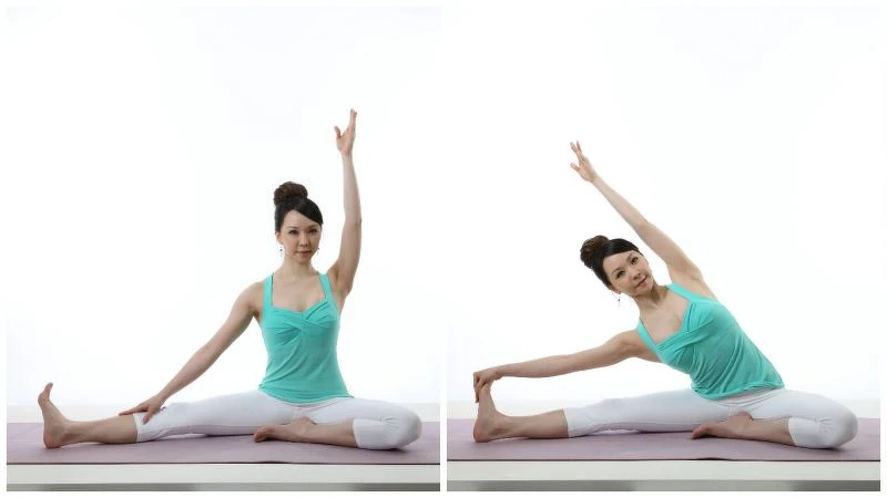 2. 吸氣,臀部向右,做到右側地面,將雙手向左上方延伸。