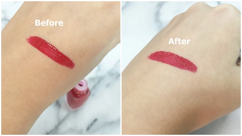 帶著像是薄紗般的霧感光澤,雙唇卻完全不會有乾澀感。這種全新的「唇露」質地,最大好處就是在塗抹時,因為是液狀,再加上裡頭加入了許多滋潤成分,包含綠茶、蘇木、杏仁油及維他命E衍生物等等,所以擦起來相當滑順滋潤,後續再轉化成霧面質地時,會更加細緻服貼,完全沒有一般霧面唇膏容易顯唇紋、色彩不均勻的缺點。