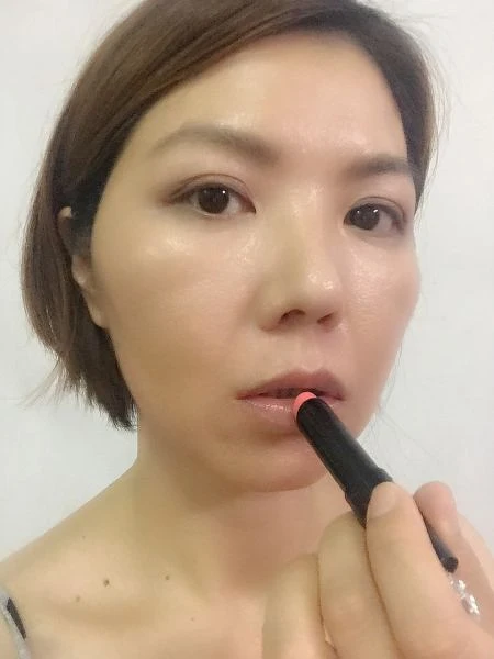 最後將「小黑裙我的香氛唇膏」由唇中往兩邊塗抹,或是用「KISSKISS法式之吻唇膏」的裸色調先將唇色微調,再上喜歡的亮色,接著再抿嘴巴,打造漸層效果。