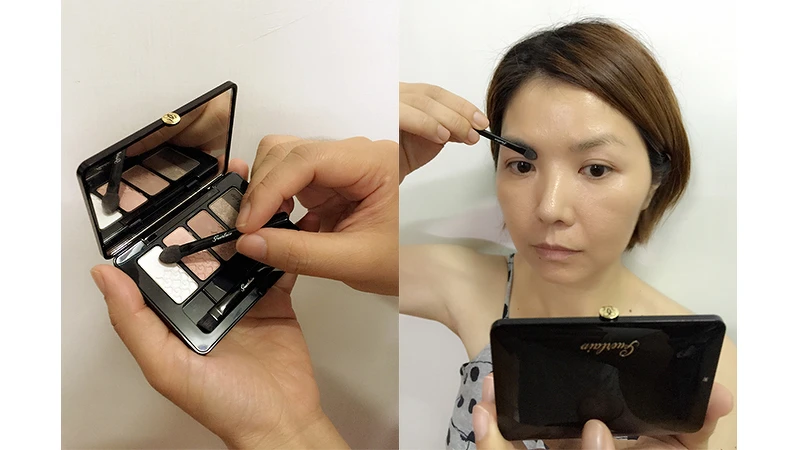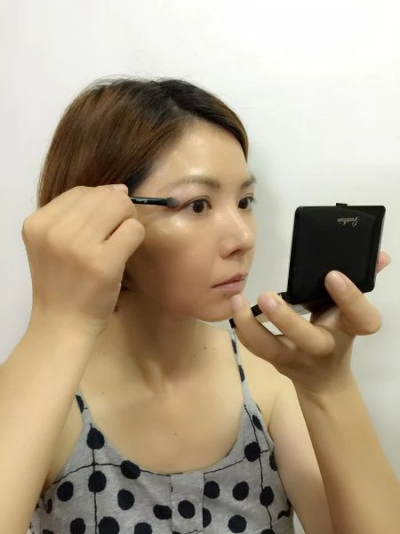 先以「時尚謬思混搭眼彩盤」左邊三個顏色打底,再利用最右邊兩個深色,在上下眼瞼以及外眼角疊擦,打造微醺效果,加深眼神的深邃感。