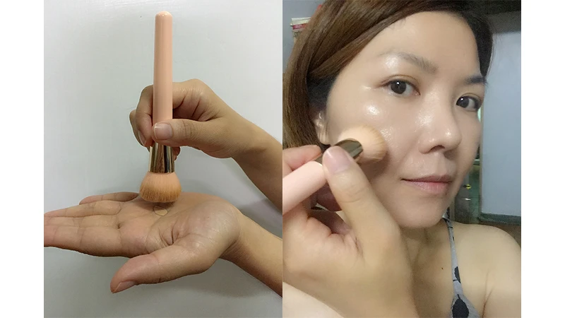 澎澎彈膚粉底刷具有聰明的輕感設計,讓你的肌膚就像拋光般,愈畫圓肌膚就愈透亮。技巧是,先將輕裸感粉底液擠在掌心中,以澎澎彈膚粉底刷來回刷一下沾粉,用畫圓的方式先從雙頰開始,剩餘的粉量再推到全臉各部位,像是T字地帶,或表情紋表較多如唇周、眼睛周圍。