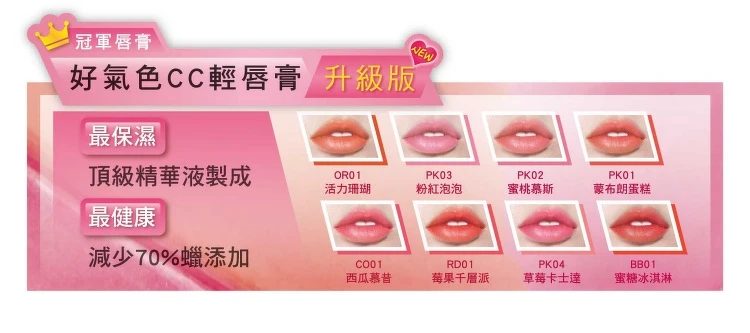 漸層粉嫩花瓣唇再進化,媚比琳最新推出好氣色CC輕唇膏,多達8款色彩,獨特微型3D粒子加上Care+ Correct保養潤色功能,讓雙唇長達12小時的保濕潤澤,不需護唇膏即能保養、潤色一次到位!不論是青春洋溢的草莓卡士達,或是稍微成熟一點的莓果千層派,都超適合隨身攜帶因應各式場合。