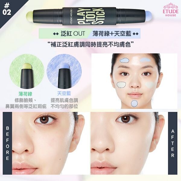 ↑↑ #2:針對泛紅局部修飾的天空藍+薄荷綠,天空藍校正輕微泛紅現象以及提亮,薄荷綠可修飾泛紅瑕疵。