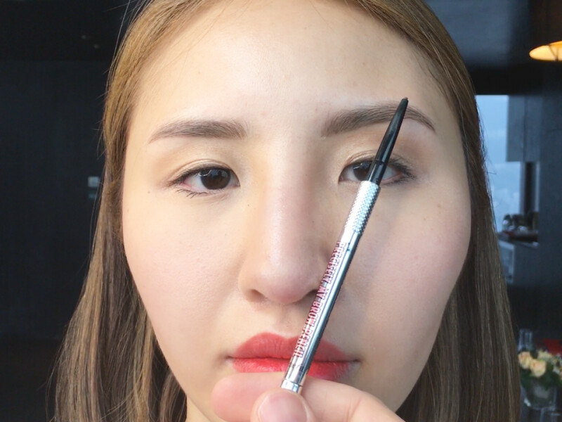 ↑眉尾要畫到哪?同樣拿起手上的眉筆,一端放在鼻翼旁,另一端則定位在眼尾,再延伸出去的點就是眉尾。