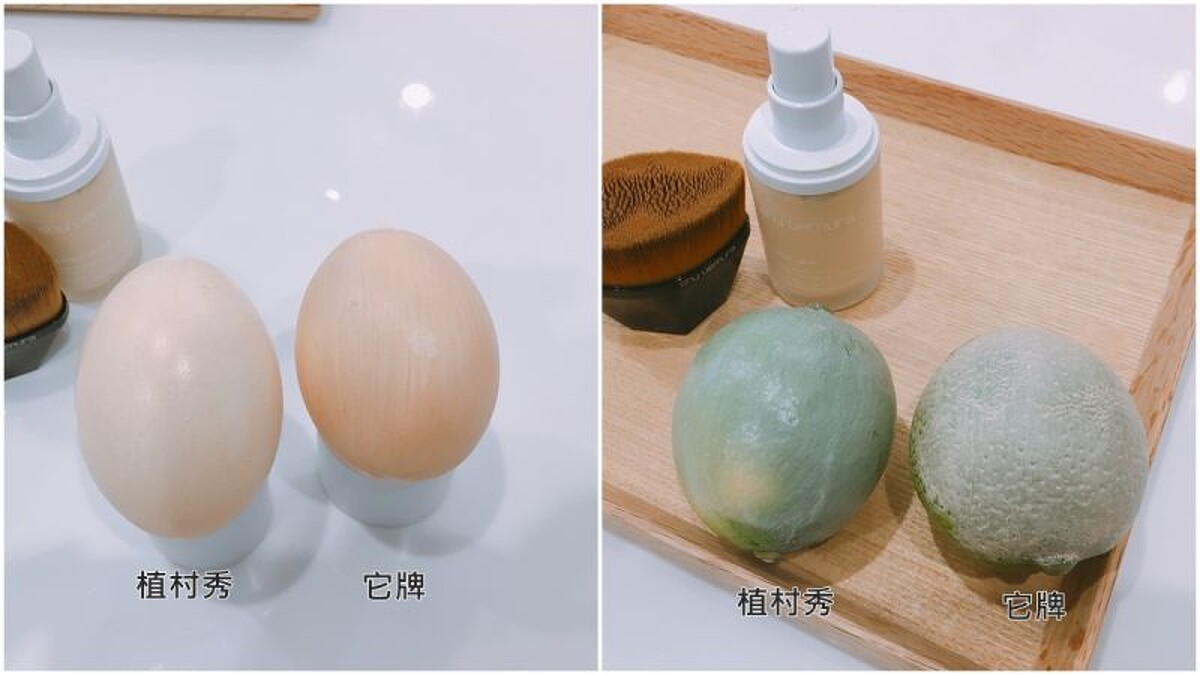 ↑不管是刷在雞蛋還是檸檬上,植村秀#55刷出來的妝感都更均勻有光澤。