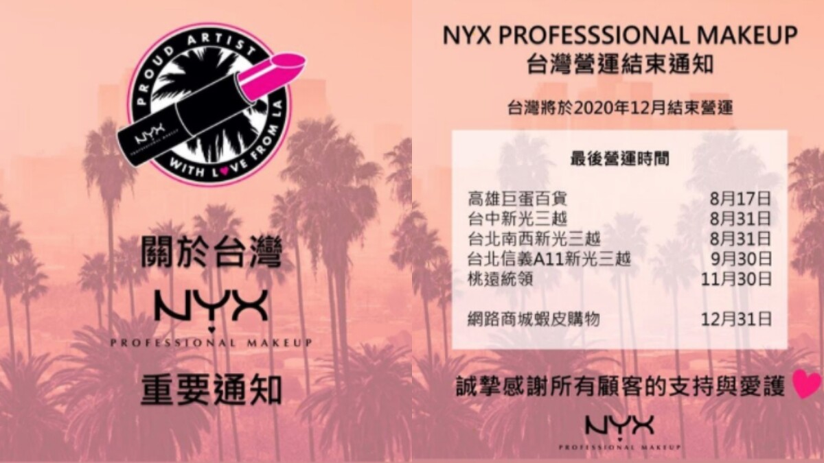 目前NYX Professional Makeup台灣專櫃僅剩下五個,分別位於高雄巨蛋百貨(營業至2020/8/17)、台中新光三越(營業至2020/8/31)、台北新光三越南西店(營業至2020/8/31)、台北新光信義新天地A11(營業至2020/9/30)、桃園統領(營業至2020/11/30)。官方在蝦皮開設的購物商城也僅營運至2020/12/31,喜歡的粉絲可得把握最後囤貨機會。