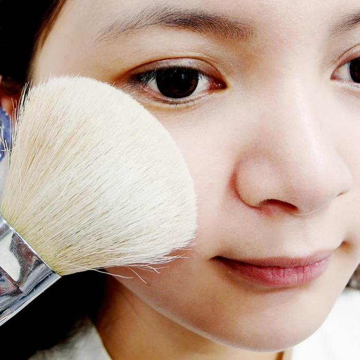 蜜粉不適合帶出門補妝,定妝效果較差,想讓底妝持久,就用粉餅來代替蜜粉;注意不要選擇過白的粉餅,會顯得臉太白不自然,蜜粉刷沾取適量粉餅,再輕刷全臉,這樣才不會太厚重。