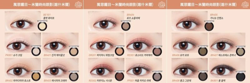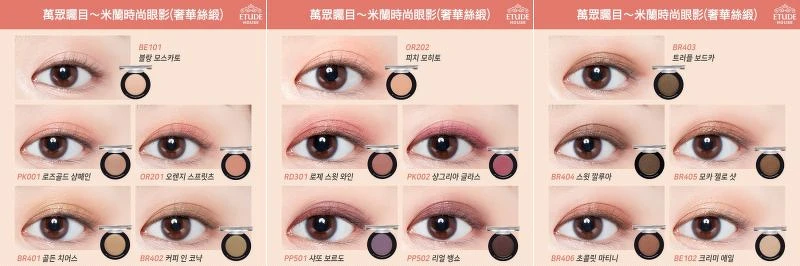 由義大利製造的實用色彩與高質感的服貼質地,ETUDE HOUSE米蘭時尚眼影以訂製服布料做為靈感,推出奢華絲緞、喀什米爾2種不同質地眼影,輕柔的粉體能完全貼合眼皮,每種質地更推出達15款色號,從實用大地色到乾燥玫瑰粉都俱全。