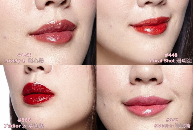現在就立刻示範四種夯色給大家瞧瞧,#367的泡泡糖,擁有極亮漆光感的夢幻粉嫩唇色,是台灣女生最愛的熱選,#426甜心粉色擁有絕美輕盈的乾燥玫瑰色,氣質滿分,#448珊瑚海鮮明的橘色系,看起來氣色超級好,最後擁有極佳時髦度的#868就愛迪奧,一擦上就是氣勢,肌膚耀眼又顯白,是不是每一個都好生火啊~