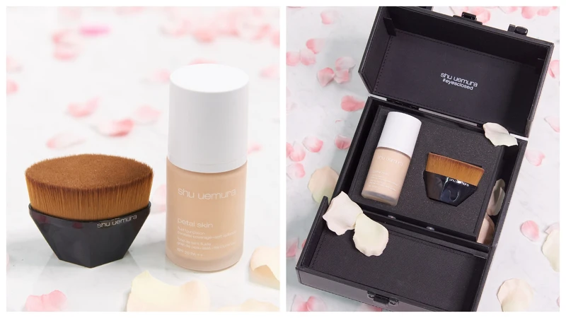 現在開始不需要羨慕,只要擁有「底妝神CP」:植村秀「花瓣肌粉亮粉底液」+「#55零刷痕粉底刷」,讓妳閉眼瞬間畫出不卡粉的柔嫩光澤"花瓣肌"。