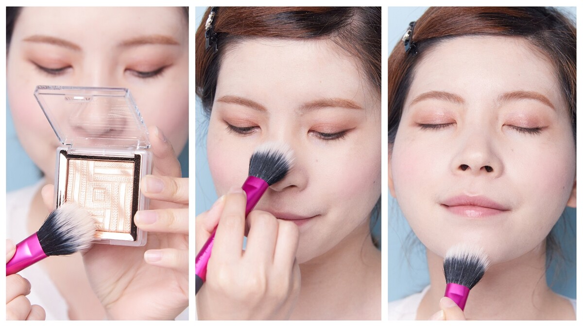 運用刷子輕刷額頭,鼻子,顴骨或下巴邊緣,優雅迷人光澤讓五官更加立體,輪廓更加鮮明,看起來肌膚質感更上一層樓。