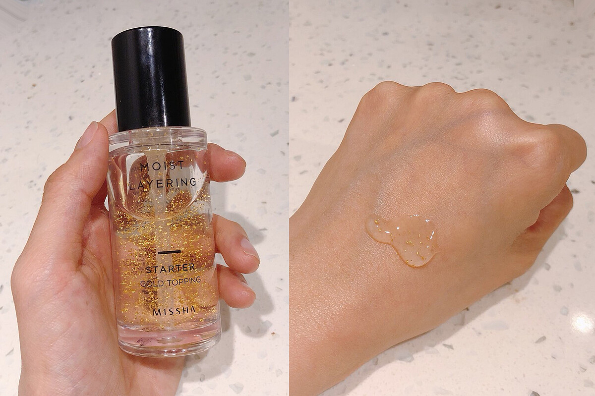 帶有金箔的MISSHA保濕妝前隔離金露的質地很好吸收,在粉底液前使用能夠幫助妝容服貼,尤其是皮膚乾容易因為缺水脫妝的女生非常適合使用,保水打底做好妝感會更持久。