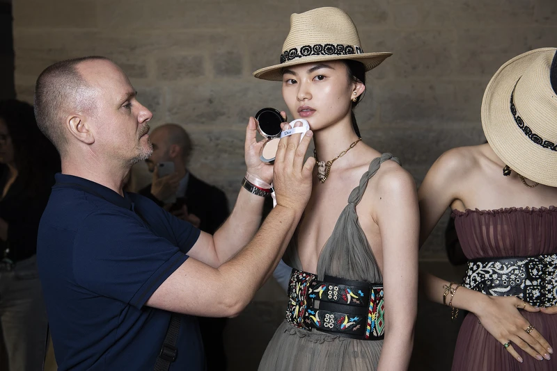 專業後台彩妝系列包括針對 6 種膚色打造16 種不同的明度、全系列共40款色選(歐美地區上市40色,亞洲地區則為21色)的『迪奧專業後台雙用水粉底』,任何膚色都能精準掌握。如空氣般輕盈親膚且防水抗汗,能打造如第二層肌膚般極自然的妝效,散發完美微霧光感。此外,臉部也使用了『迪奧專業後台修容盤』N°001內的淺色以及修容色,不著痕跡地雕塑輪廓立體度。然後再以『迪奧專業後台打亮腮紅盤』的 N°001,調和白與淺金兩色,在顴骨處增添細緻光感並打亮。最後再加上一點點超完美隱形遮瑕膏,修飾掉所有小瑕疵,讓底妝更顯乾淨精緻。