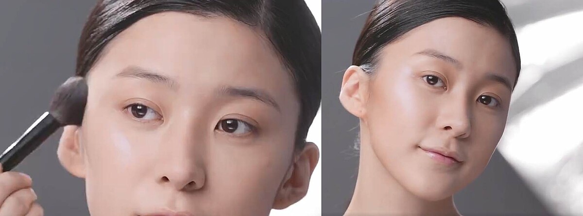 上完底妝後,使用添加鑽石光蜜粉的自然礦物蜜粉,輕刷一層於T字顴骨,接著透過自然礦物修容刷於下巴、下巴兩側和太陽穴,創造出立體小V臉。