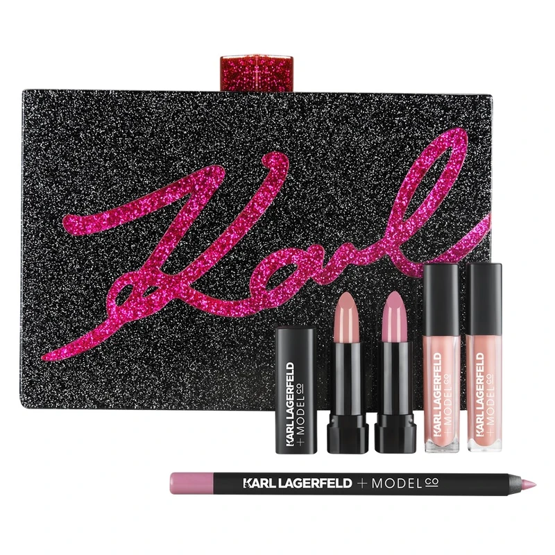 組合內含迷你版的2支唇膏、2支唇蜜及1支唇線筆,顏色以裸粉與蜜桃色系為主。外盒也充滿設計感,閃耀的亮彩黑底搭配桃紅色Karl Lagerfeld最經典的簽名點綴設計,外型就如同一個時髦晚宴包,CP值超高!極少量限時推出,非常值得收藏!