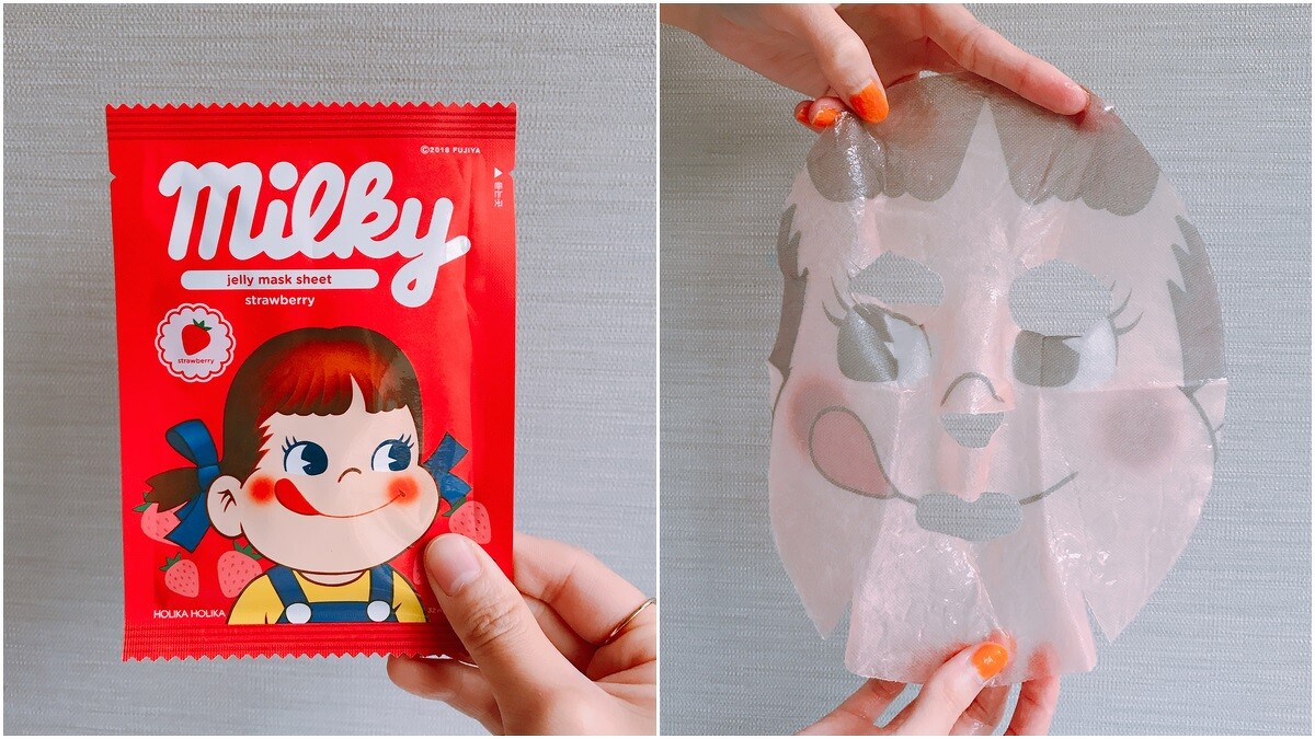 還有牛奶妹圖案的凝凍面膜,推出草莓口味的香氣,零食造型的外包裝更是吸睛。