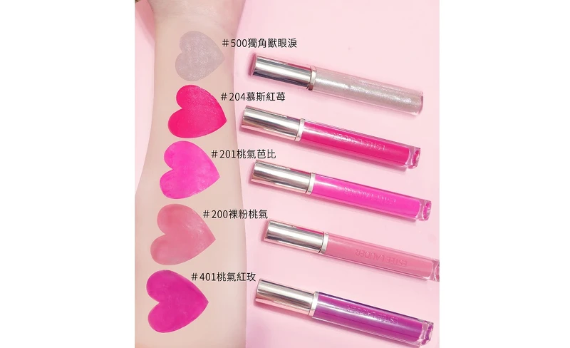 玩色戀愛唇釉,6ml,NT$950。左至右:#401桃氣紅玫、#200裸粉桃氣、#201桃氣芭比、#204慕斯紅苺、#500獨角獸眼淚