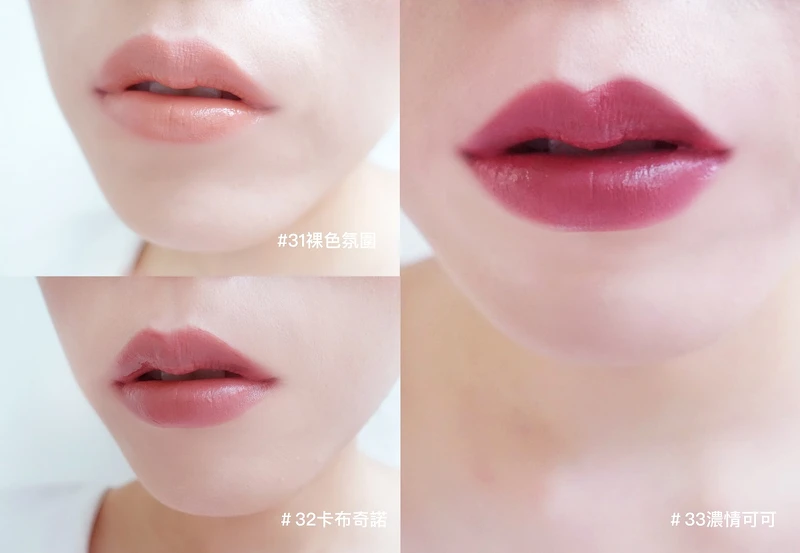 對裸色和土色情有獨鍾的女孩們,M編也都試色完畢。#33濃情可可也是推薦化妝包裡的必備色,白天用#28蜜桃甜心,晚上聚會或是重要場合就可以換上#33濃情可可,偏紅的咖啡色讓膚色立刻白一階,讓人無法抵擋的甜美性感,也是一試擦就完全被擄獲的必收色號!