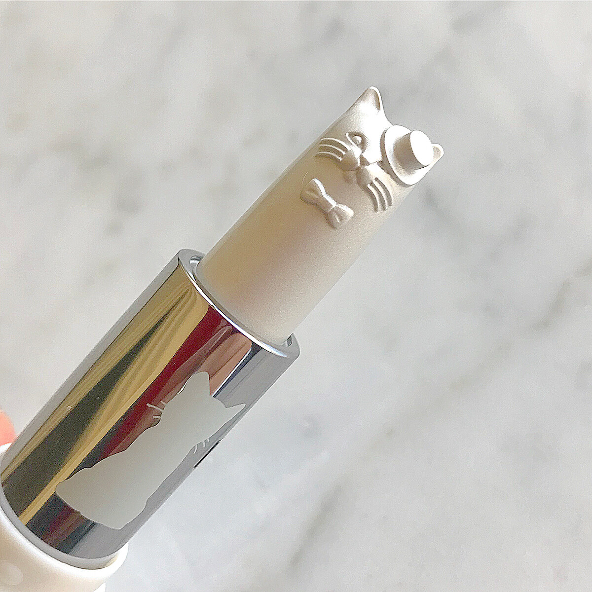 另外一款「銀色月光俏貓打亮膏」,打開純白色外殼,旋轉出來的是一隻銀白色帶著小帽子、打領結的貓咪紳士,精緻到讓人捨不得用!