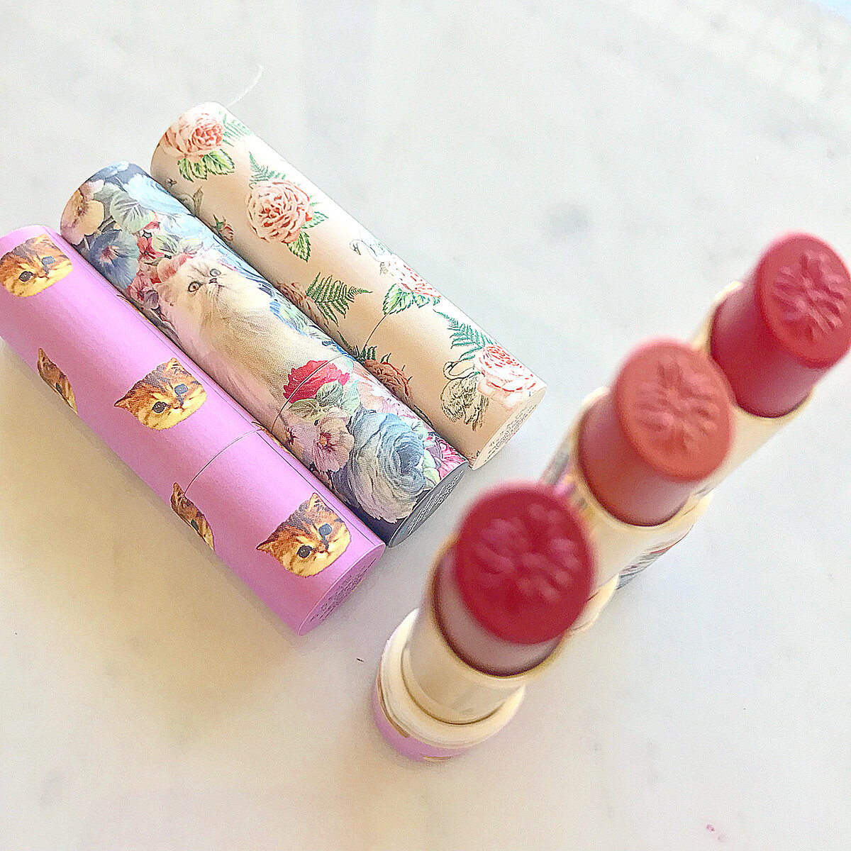 還推出懷舊可愛的限量唇膏盒。唇膏盒採用限量版印花設計,有花園貓咪、粉紫貓、玫瑰花園三種印花。