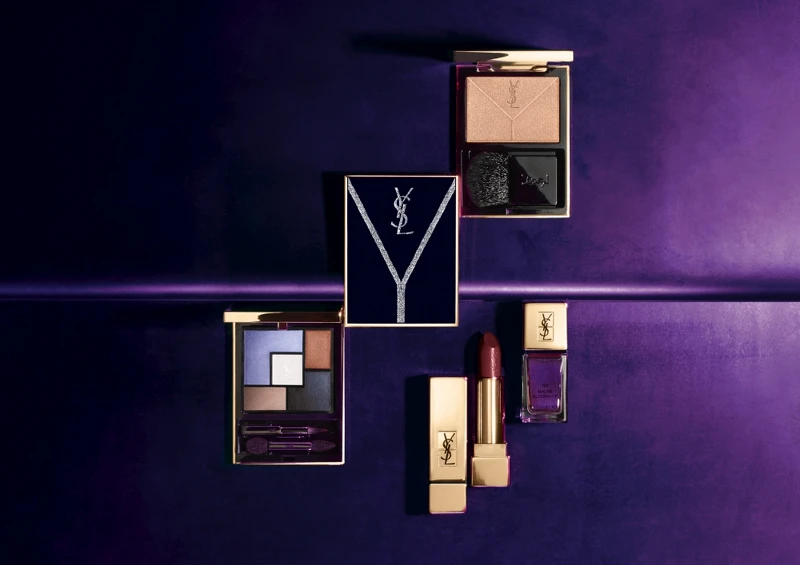 完如重現YSL先生於1962年第一場秀的紫色柔紗晚禮服,配色以不同層次的紫色、裸膚和鑽石色彩拼接而成。外盒更是以經典的Y字剪裁,顯示出女人極具修長性感的Y曲線,並烙上如同珠寶般的浮雕設計。