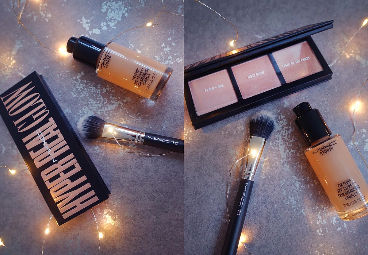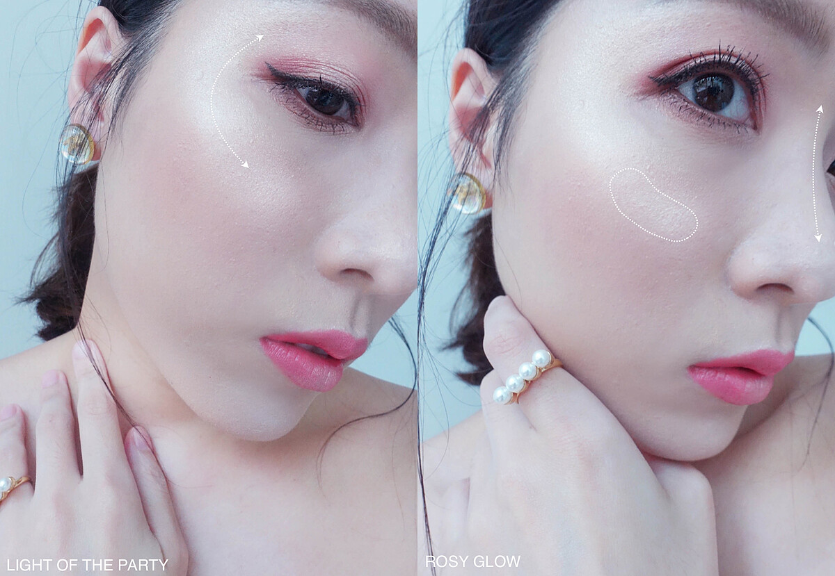 在顴骨處刷上LIGHT OF THE PARTY奢華香檳金+ROSY GLOW女神玫瑰金疊擦腮紅光點+鼻樑