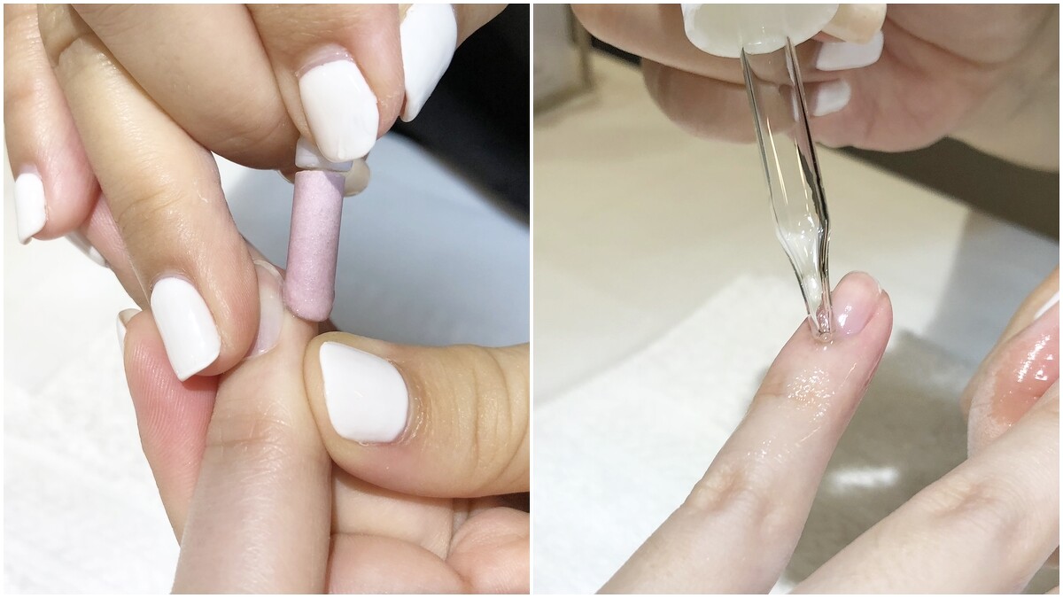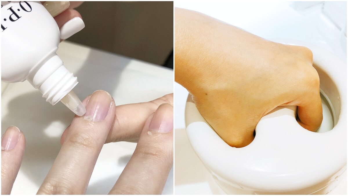 1.先在指緣塗上甘皮軟化劑,並稍微搓揉後,泡一下溫水讓甘皮軟化。
