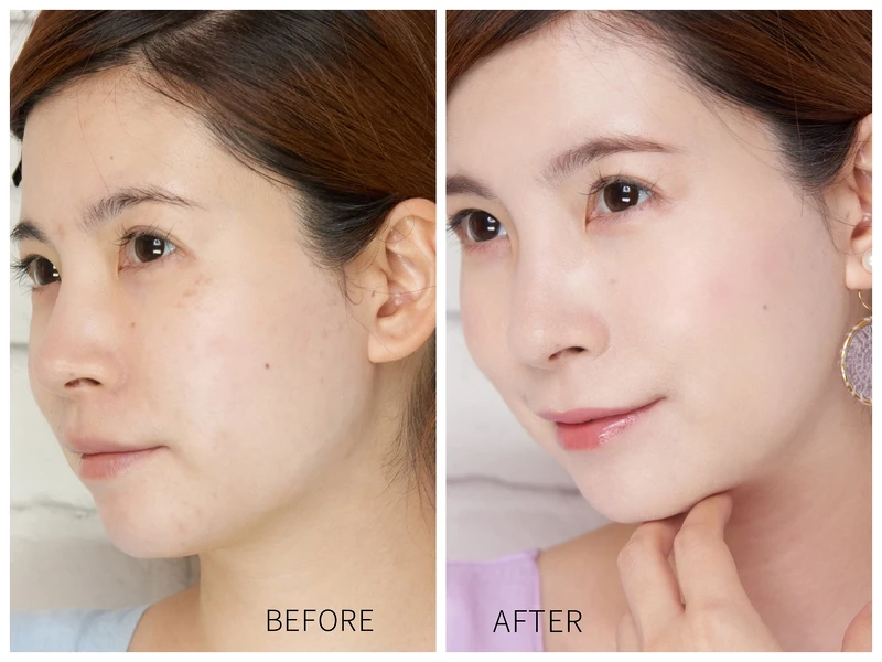 上妝後,肌膚看起來細緻無瑕,從裡到外透出美麗潤澤的鮮奶油光澤,瑕疵遮得很自然,好像天生膚質就這麼光滑這麼好、招桃花沒煩惱。