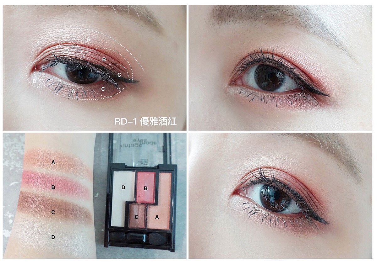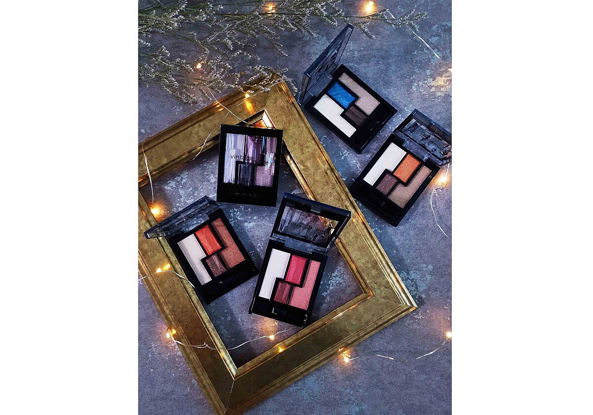 「懷舊摩登眼影盒」全系列共5款: RD-1 優雅酒紅、BR-1 摩登橘棕、 PU-1 洗鍊典雅紫、 BR-2 率性金棕、BU-1華麗土耳其藍,一盒中有淺色、主色調、深色調、以及打亮色4種色,就可以變化出多種妝感。