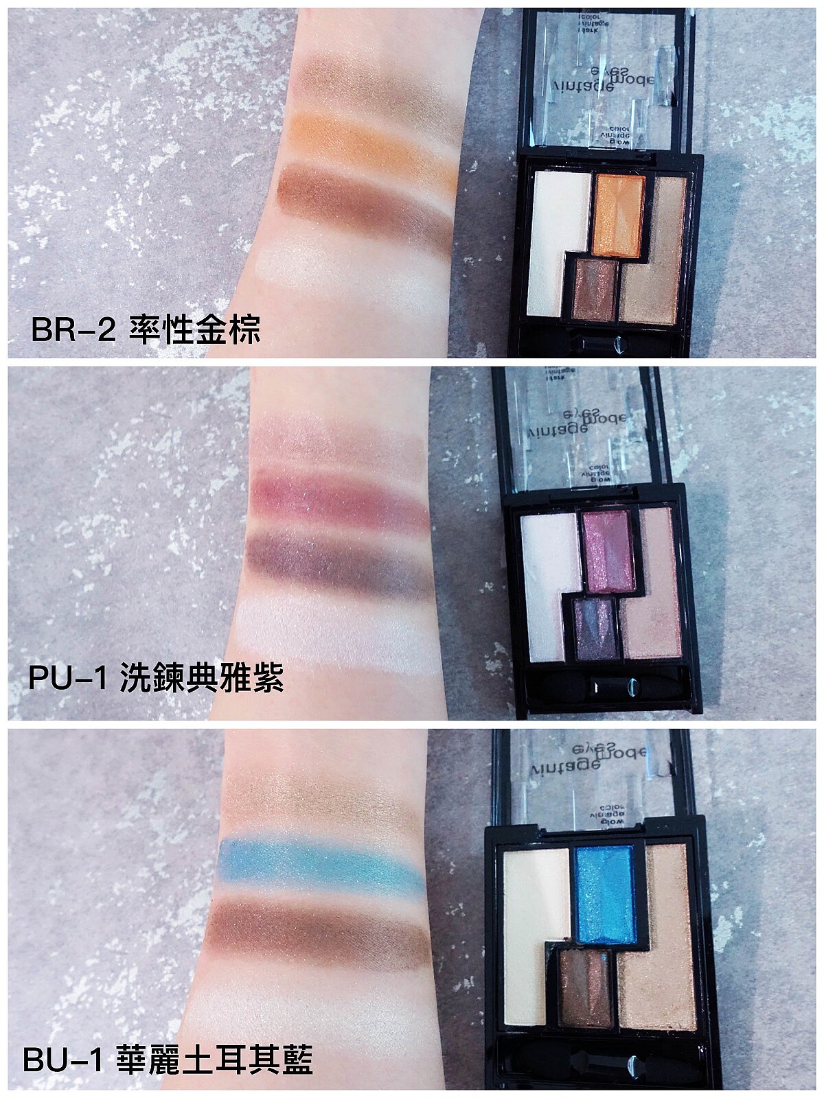 還有另外三款每盤都是, 每個女孩都能輕鬆駕馭的「BR-2 率性金棕」、既神秘又性感的「PU-1 洗鍊典雅紫」、以及奢華高調「BU-1華麗土耳其藍」,一直很害怕駕馭紫色或藍色眼影的M編,「懷舊摩登眼影盒」的暗濁色澤,懷舊紫和土耳其藍色,美到完全很可以!