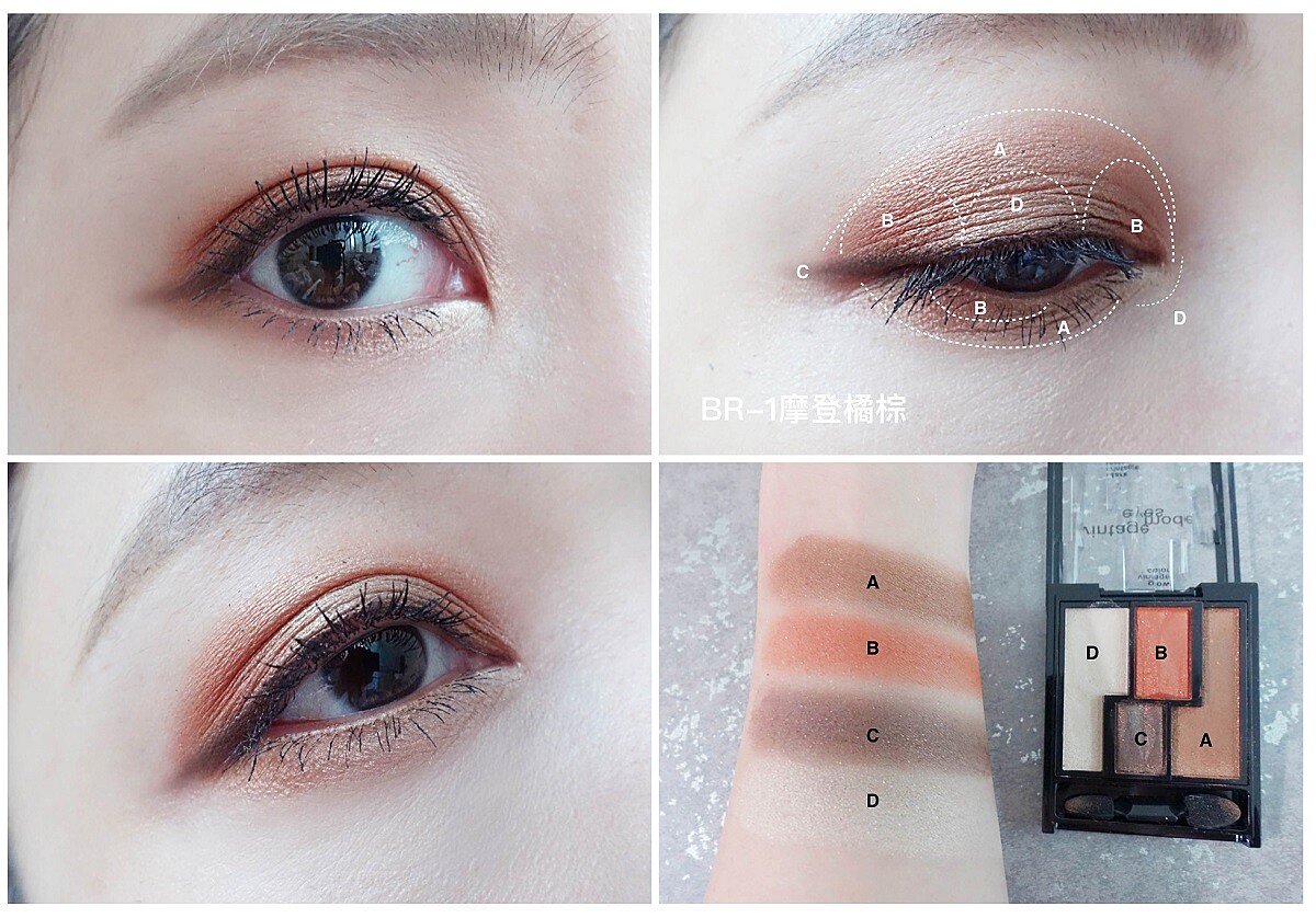 (A)中間色:當作打底色,用於整個眼窩及下眼影,柔和的提亮整個眼窩色澤。