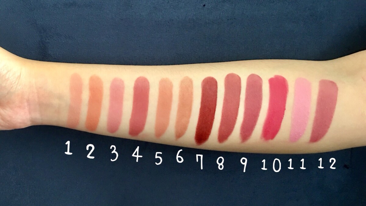 #1裸粉花蕊、#2可口花蜜、#3粉紅康乃馨、#4氣質裸玫(主打色)、#5蜜糖甜芯、