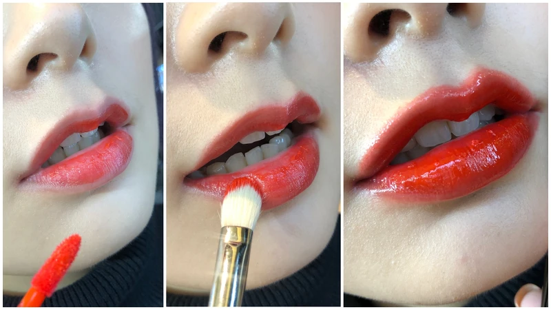 2.先將12H染唇露輕點在唇瓣內側上下半圓,再使用M·A·C彩妝師人手一支的#217刷,保留唇中的水光度,從唇瓣外圈位置由內往外暈染,讓外圈線條變得更柔和,稍微大膽的暈出唇邊界線,讓雙唇感覺更豐滿嘟彈,即可創造外霧內亮、由淺到深的激吻染唇妝效果。