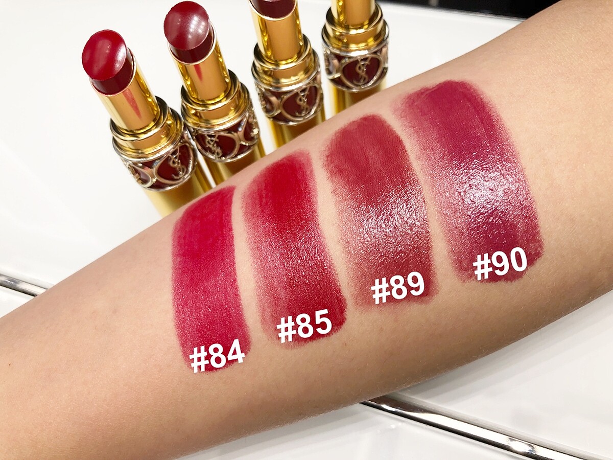 目前已釋出「復古漿果紅」色系的4色:#84 RED CASSANDRE撩撥紅唇、#85 BURGUNDY LOVE沉醉之吻、#89 ROSE BLAZER珊情熱吻、#90 PLUM TUNIQUE放肆索吻。
