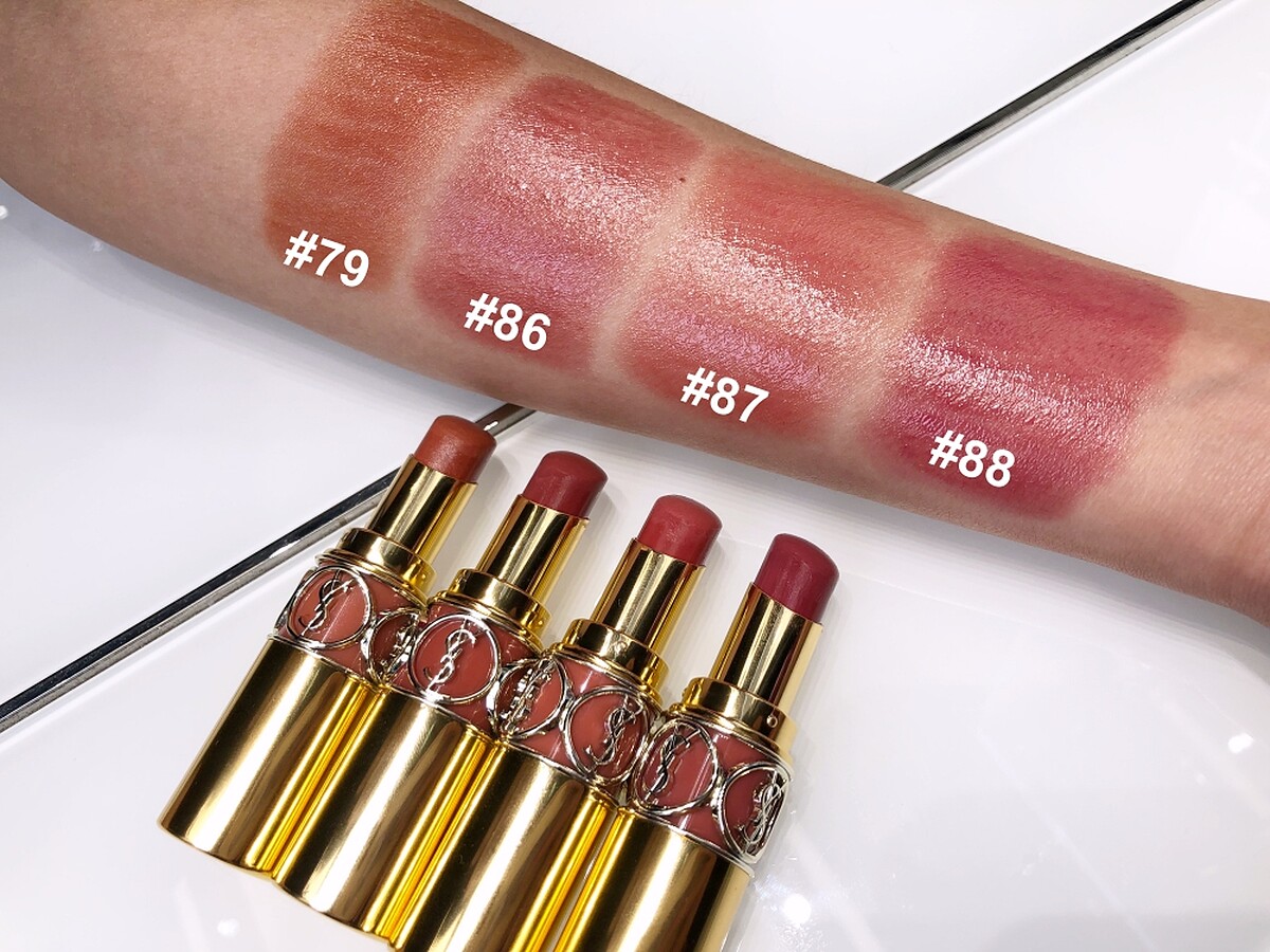 另外還有粉棕色系4色:NO 79 CORAL PLUME昨夜吻痕、NO 86 MAUVE CUIR纏綿之吻、NO 87 ROSE AFRIQUE玫瑰輕吻、NO 88 ROSE NU枕邊唇語
