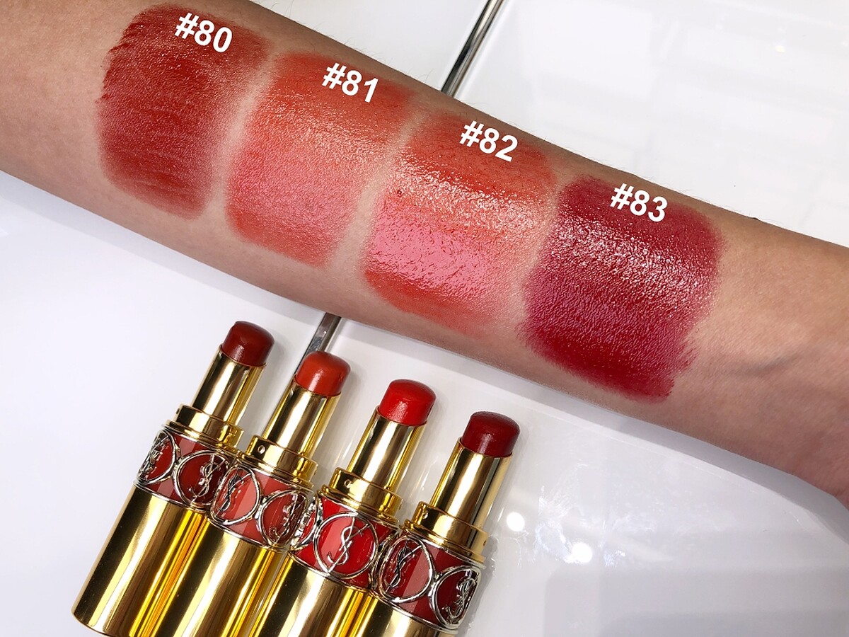 還有蕃茄紅色系4色:NO 80 CHILI TUNIQUE火辣激吻、NO 81 CORAL AVIATOR 陽光擁吻、NO 82 ORANGE CRÊPE 蜜桃甜吻、NO 83 ROUGE CAPE 熱烙唇印