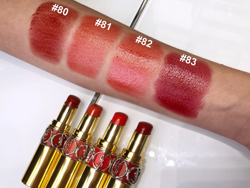 還有蕃茄紅色系4色:NO 80 CHILI TUNIQUE火辣激吻、NO 81 CORAL AVIATOR 陽光擁吻、NO 82 ORANGE CRÊPE 蜜桃甜吻、NO 83 ROUGE CAPE 熱烙唇印