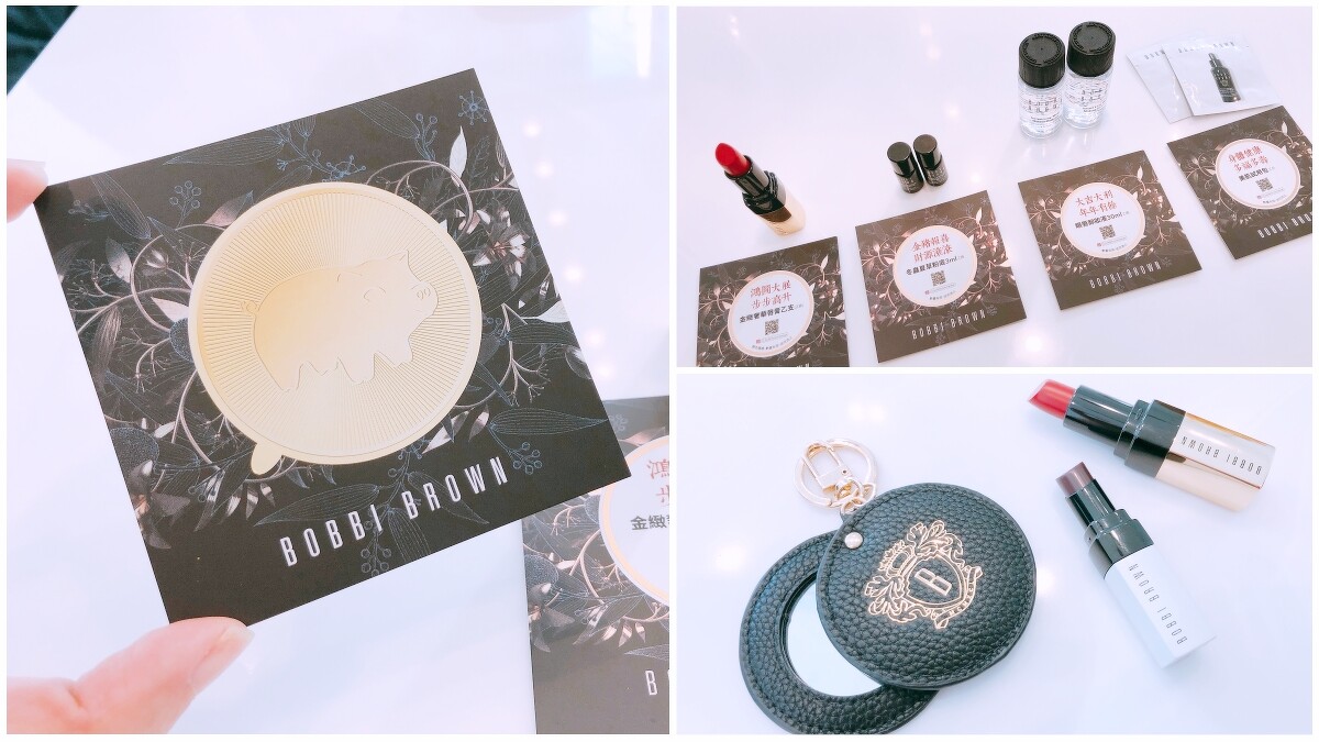 1.2019/1/1-2019/1/31至全台Bobbi Brown專櫃體驗「冬蟲夏草粉底」或「限量皇室紅系列」,並追蹤@BobbiBrownTaiwan IG,即可免費兌換100%中獎率小豬金幣卡一張,撕開金色貼紙即可得贈品,有機會獲得價值NT1,200正貨唇膏(贈品數量有限送完為止)!