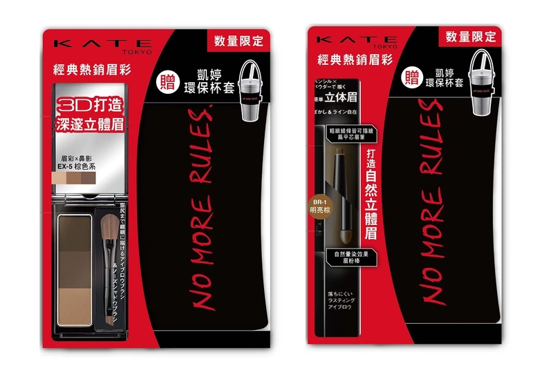 (左)KATE「3D造型眉彩餅」,濃中淡3色組合的眉彩餅,可畫出柔和自然的眉毛,創造出立體深邃的眼部印象,粉質細密且持粧不易脫落,眉粉界經典王道款,絕對是眉毛新手必備。